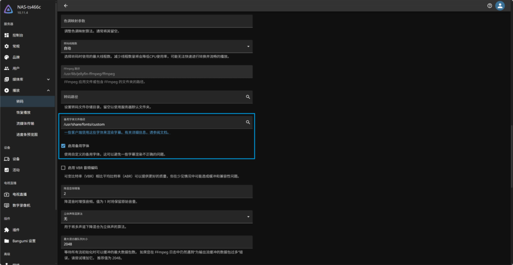 现在我们要在 Jellyfin 中开启使用这些添加的字体文件,在 控制台-播放-转码 中找到 备用字体文件路径 填写并启用,路径则是我们之前在 docker compose 中填写的容器内路径。
