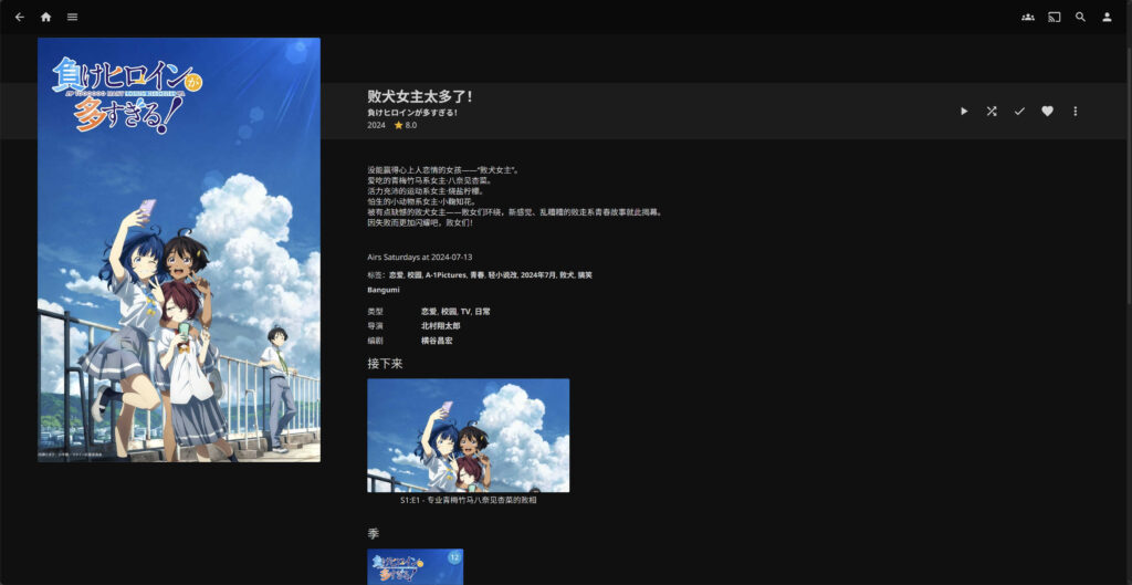解压完成后,我们重启 Jellyfin 即可自动加载 Bangumi 插件。此时,将动画导入媒体库中,即可自动刮削相关信息,如图所示。同时,我们也可以在 Jellyfin 的插件设置中找到 Bangumi 设置,登录账号即可同步播放信息。